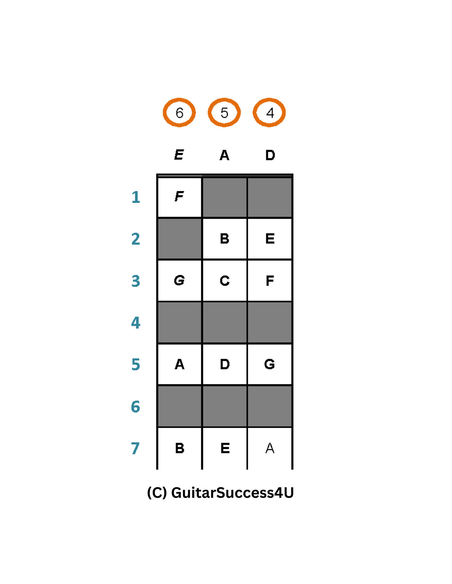First, memorize the bottom 3 strings, strings 6, 5 and 4.